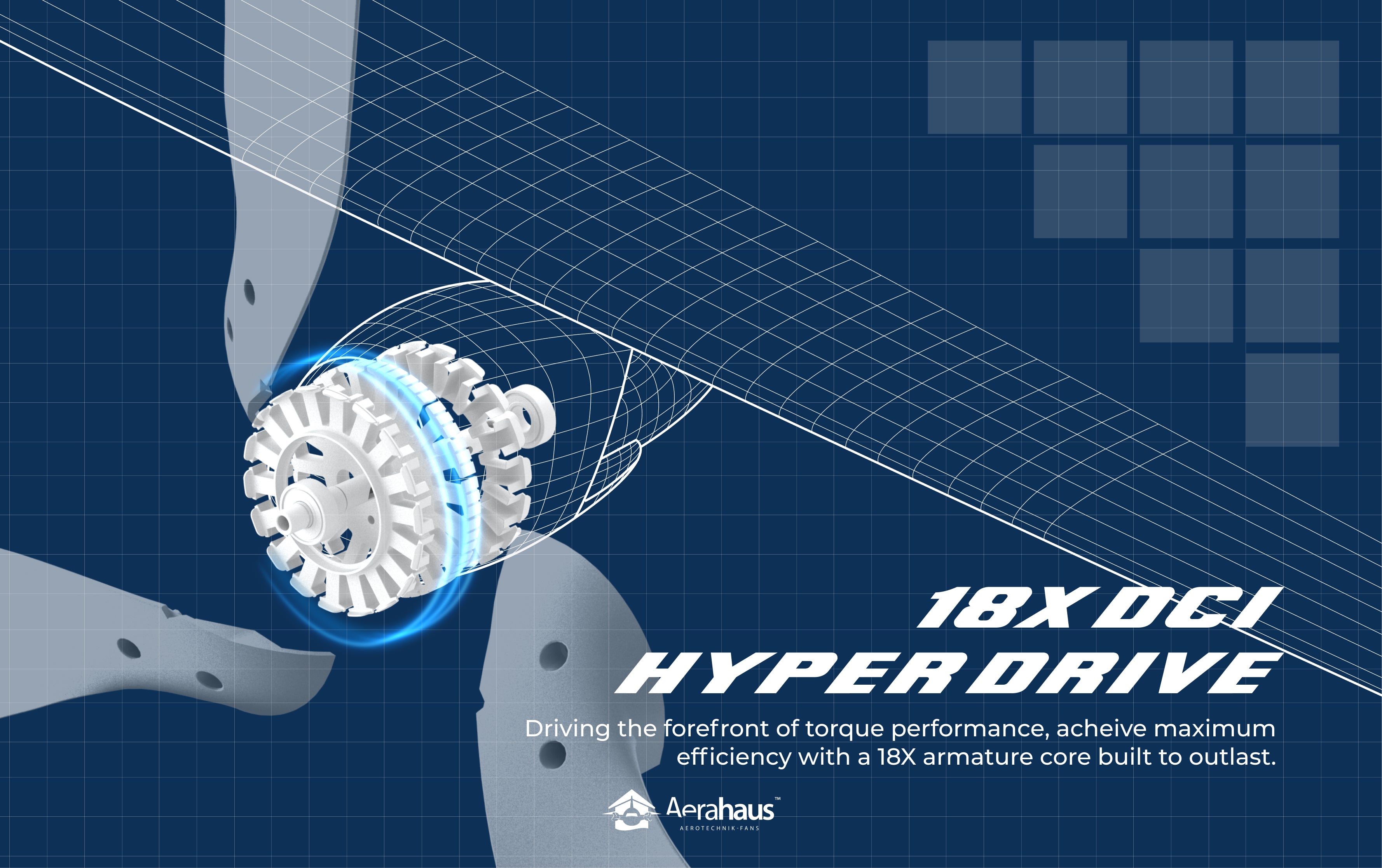 Driving the forefront of torque performance. The Aerahaus in house manufactured Hyperdrive DC Motor Technology ensures maximum efficiency with a 18X armature core enabling smooth progression across different Preset settings.